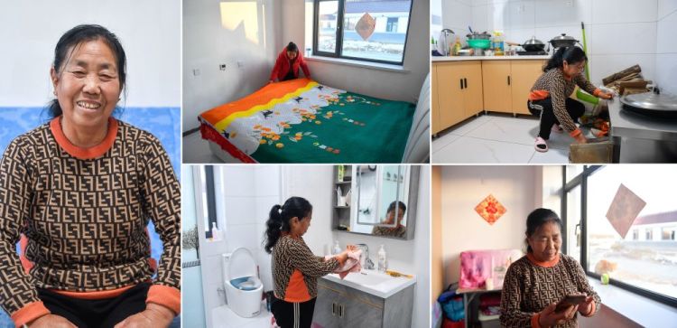 吉林省舒兰市开原镇新开村村民徐中仁在新房子中的生活场景(12月7日摄,拼版照片)。徐中仁说,“土炕”变“大床”,WIFI、自来水、室内马桶一应俱全,新房子让她体验上了“城里的生活”。新华社记者 许畅 摄