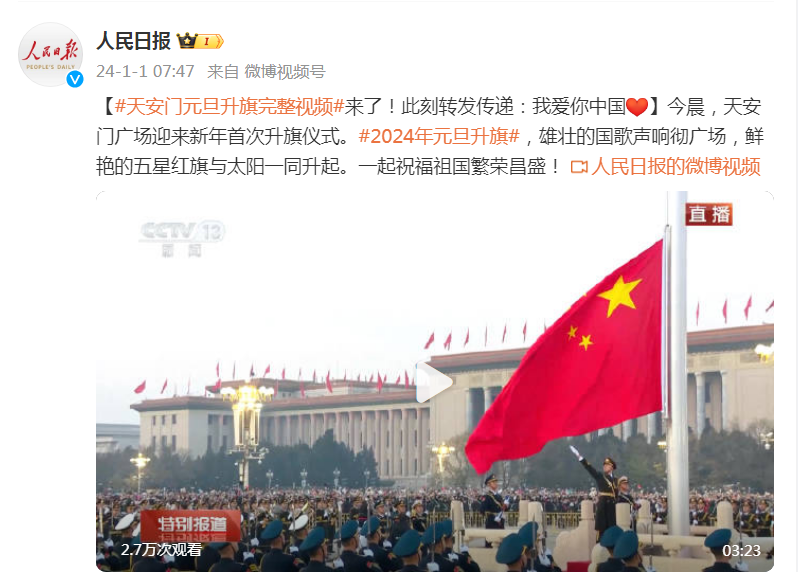 今晨,天安门广场迎来新年首次升旗仪式。2024年元旦升旗,雄壮的国歌声响彻广场,鲜艳的五星红旗与太阳一同升起。一起祝福祖国繁荣昌盛!