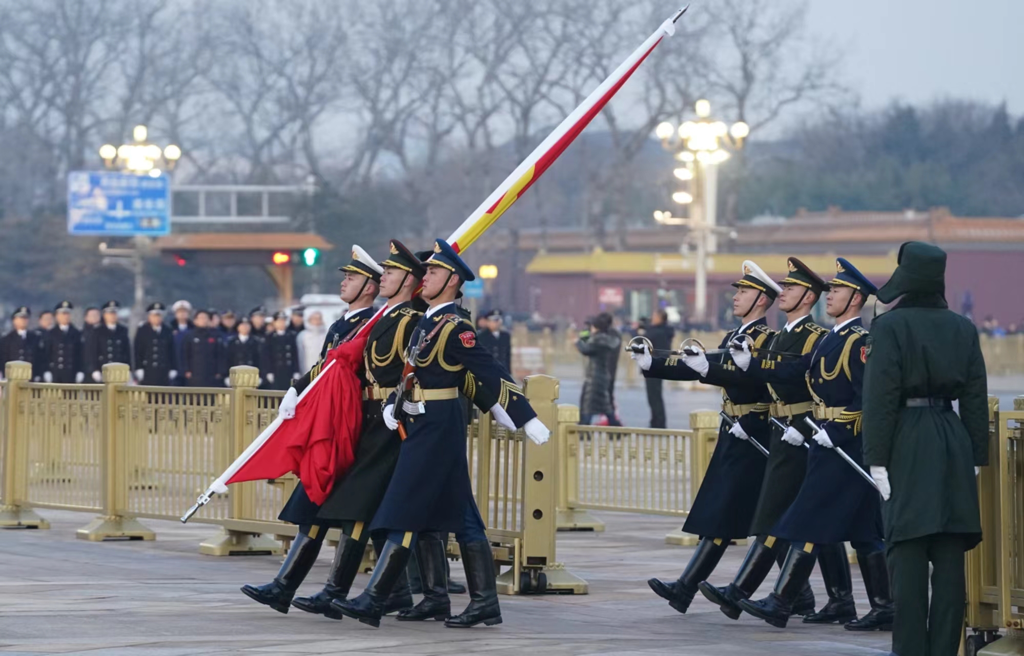 7点33分左右,庄严神圣的时刻到了!升旗仪式按高规格举行,解放军军乐团礼号手在城楼吹响升旗号角,随着一声口令,三军仪仗队护旗编队迈着铿锵有力的步伐走过城楼中央、金水桥,礼兵肃立在两侧。现场群众纷纷拿出手机、相机,记录下这激动人心的时刻。