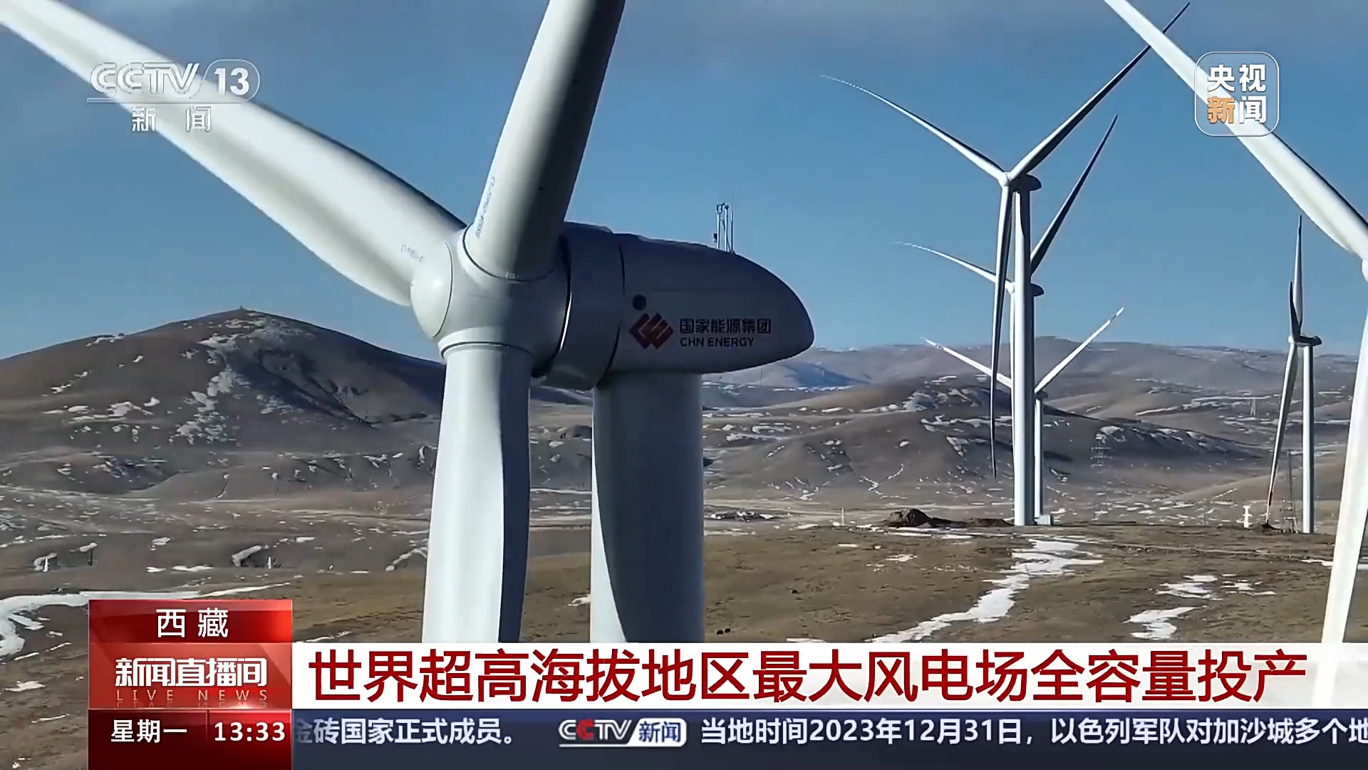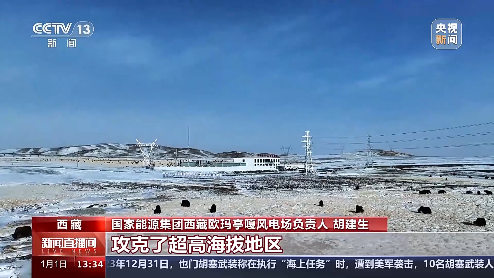 总台央视记者 张丛婧:我现在就在西藏那曲欧玛亭嘎风电场,这里的海拔有4800米。这个风电场有25台单机容量4.0兆瓦的风机,是目前我国超高海拔地区单机容量最大的风电机组。这里产生的电能主要输送到那曲地区,全容量投产后,能够满足当地23万人一年的用电量。