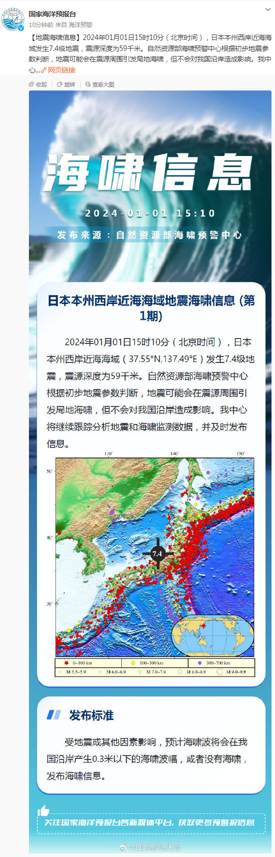2024年01月01日15时10分(北京时间),日本本州西岸近海海域(37.55°N,137.49°E)发生7.4级地震,震源深度为59千米。自然资源部海啸预警中心根据初步地震参数判断,地震可能会在震源周围引发局地海啸,但不会对我国沿岸造成影响。我中心将继续跟踪分析地震和海啸监测数据,并及时发布信息。