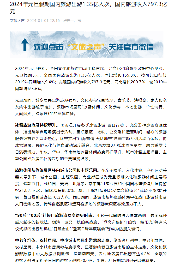 元旦期间,城乡居民出游意愿强烈,文化参与氛围浓厚,音乐节、演唱会,家人和亲友集体出游趋于增加。旅游市场呈现“冰雪休闲、文化参与,本地出游、个性消费,人间烟火、欢乐祥和”的总体特征。