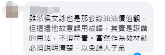不过,也有人认为侯文咏是“故意误用成语”,“其实是诙谐的用法,不须苛责,当然作为教材就必须说明清楚,以免误人子弟”。↓