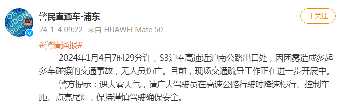 2024年1月4日7时29分许,S3沪奉高速近沪南公路出口处,因团雾造成多起多车碰擦的交通事故,无人员伤亡。目前,现场交通疏导工作正在进一步开展中。