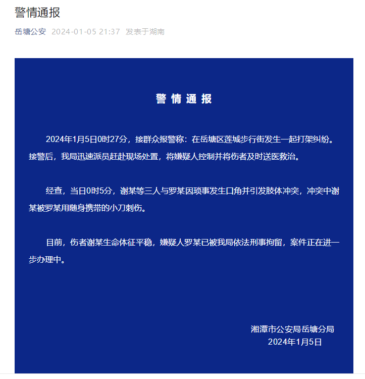 2024年1月5日0时27分,接群众报警称:在岳塘区莲城步行街发生一起打架纠纷。接警后,我局迅速派员赶赴现场处置,将嫌疑人控制并将伤者及时送医救治。