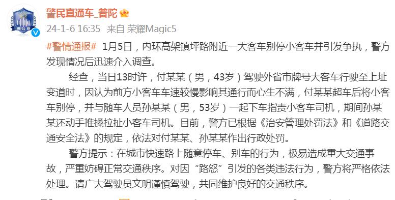经查,当日13时许,付某某(男,43岁)驾驶外省市牌号大客车行驶至上址变道时,因认为前方小客车车速较慢影响其通行而心生不满,付某某超车后将小客车别停,并与随车人员孙某某(男,53岁)一起下车指责小客车司机,期间孙某某还动手推搡拉扯小客车司机。目前,警方已根据《治安管理处罚法》和《道路交通安全法》的规定,依法对付某某、孙某某作出行政处罚。