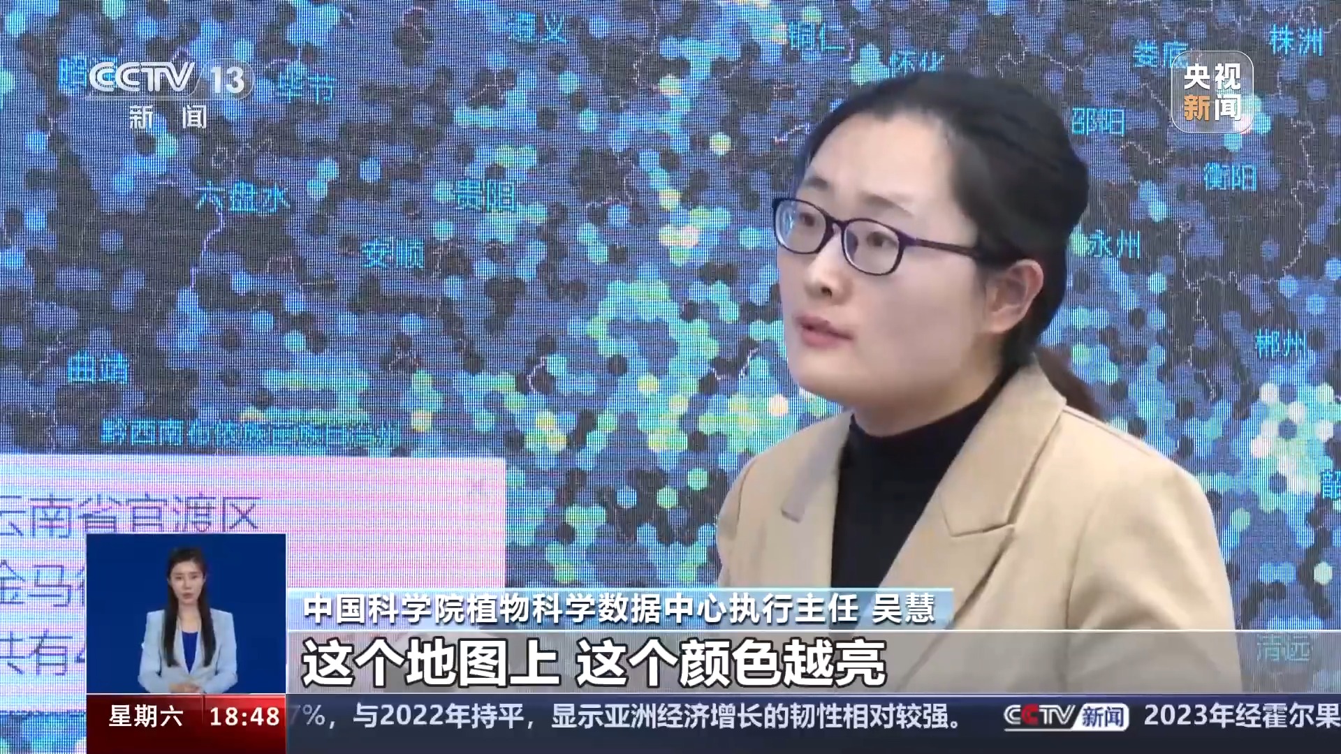 中国科学院植物科学数据中心执行主任 吴慧:这个地图上,这个颜色越亮,代表这个区域分布的我们的重点野生植物越多。