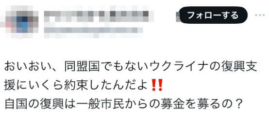 还有网民质问:“喂,为了支援非盟国乌克兰花了多少钱啊!本国的重建却要从普通市民那里募捐?”