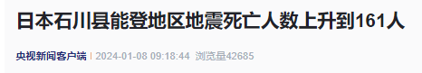 据央视新闻客户端消息,根据日本石川县1月8日公布的最新统计数据,石川县能登地区地震造成的死亡人数上升到161人,下落不明人数调整为103人。