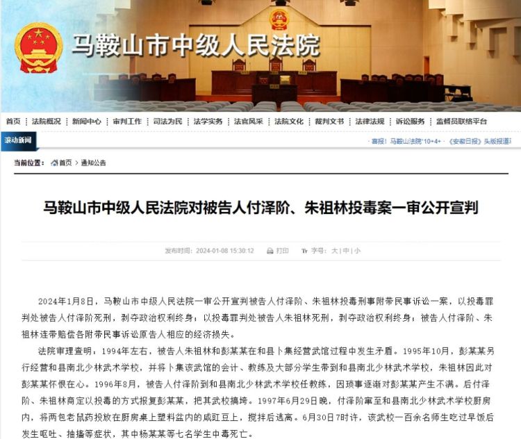 2024年1月8日,马鞍山市中级人民法院一审公开宣判被告人付泽阶、朱祖林投毒刑事附带民事诉讼一案,以投毒罪判处被告人付泽阶死刑,剥夺政治权利终身;以投毒罪判处被告人朱祖林死刑,剥夺政治权利终身;被告人付泽阶、朱祖林连带赔偿各附带民事诉讼原告人相应的经济损失。