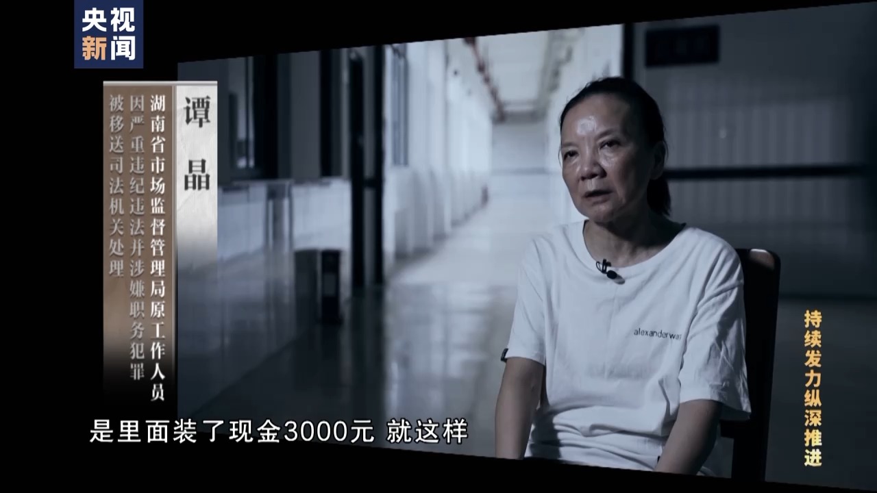 湖南省市场监督管理局原工作人员 谭晶:他就拿了一个信封,在没人的地方他就悄悄塞给我,他说是我们单位的资料。然后我回去以后发现是里面装了现金3000元,就这样。所以我不逃避我自己的(责任),犯了法要承担法律的责任,一定要。