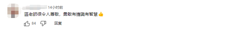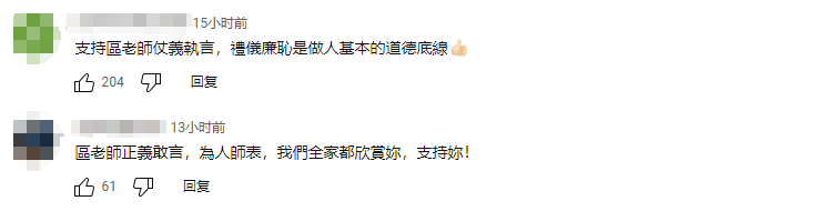 节目下方评论区有岛内网民表示:“支持区老师仗义执言,礼义廉耻是做人基本的道德底线。”有网民说:“区老师正义敢言,为人师表,我们全家都欣赏你,支持你!”还有网民说:“区老师很令人尊敬,勇敢有胆识有智慧”。