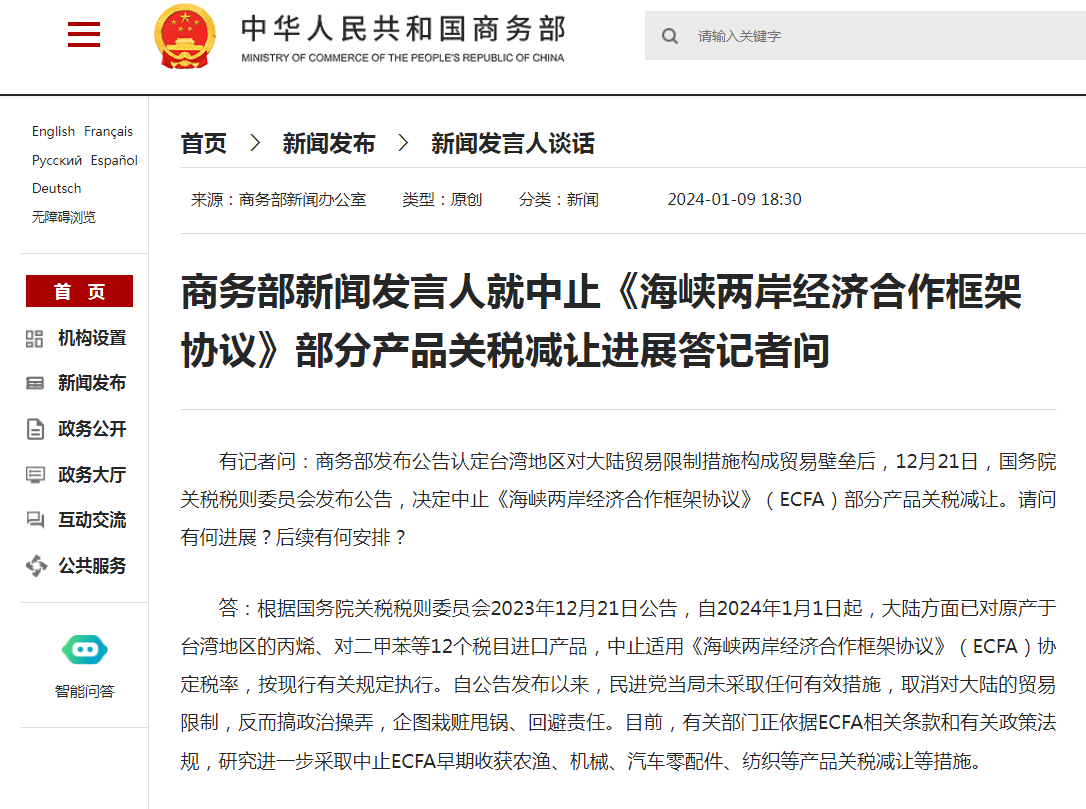 答:根据国务院关税税则委员会2023年12月21日公告,自2024年1月1日起,大陆方面已对原产于台湾地区的丙烯、对二甲苯等12个税目进口产品,中止适用《海峡两岸经济合作框架协议》(ECFA)协定税率,按现行有关规定执行。自公告发布以来,民进党当局未采取任何有效措施,取消对大陆的贸易限制,反而搞政治操弄,企图栽赃甩锅、回避责任。目前,有关部门正依据ECFA相关条款和有关政策法规,研究进一步采取中止ECFA早期收获农渔、机械、汽车零配件、纺织等产品关税减让等措施。