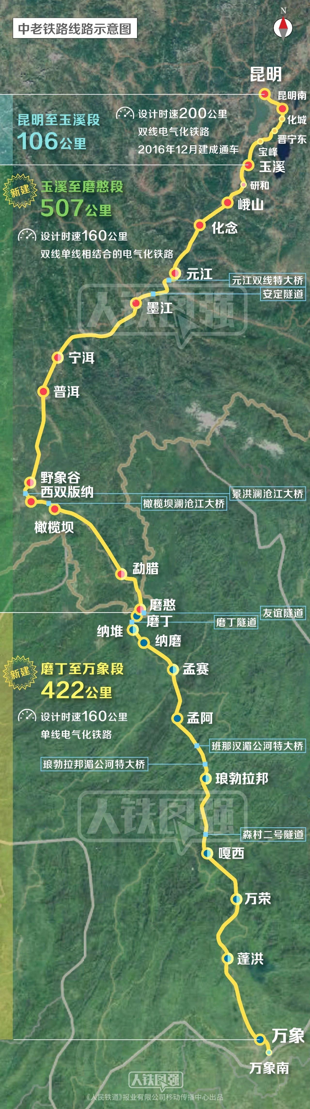 中老铁路是与中国铁路网直接连通的国际铁路,线路全长1035公里,北起中国西南地区的昆明市,向南经玉溪市、普洱市、西双版纳傣族自治州,过中国磨憨铁路口岸和老挝磨丁铁路口岸,进入老挝北部地区,继续向南经琅南塔省、乌多姆赛省、琅勃拉邦省、万象省,到达老挝首都万象市。