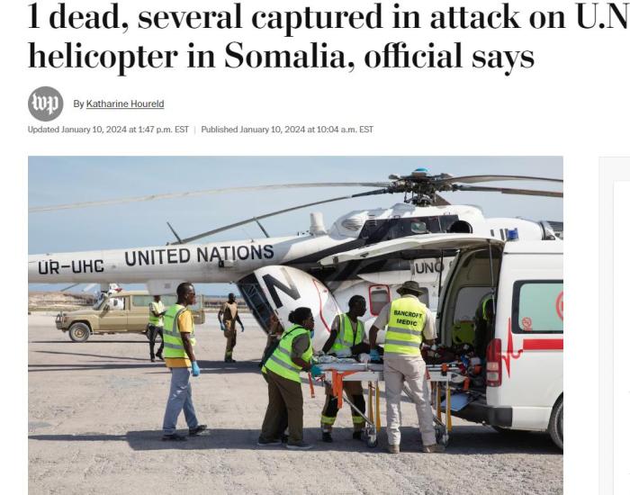 中新网1月11日电 美国《华盛顿邮报》援引消息人士称,当地时间10日,联合国一架直升机因故紧急迫降在加尔古杜德州后,被索马里“青年党”劫持。