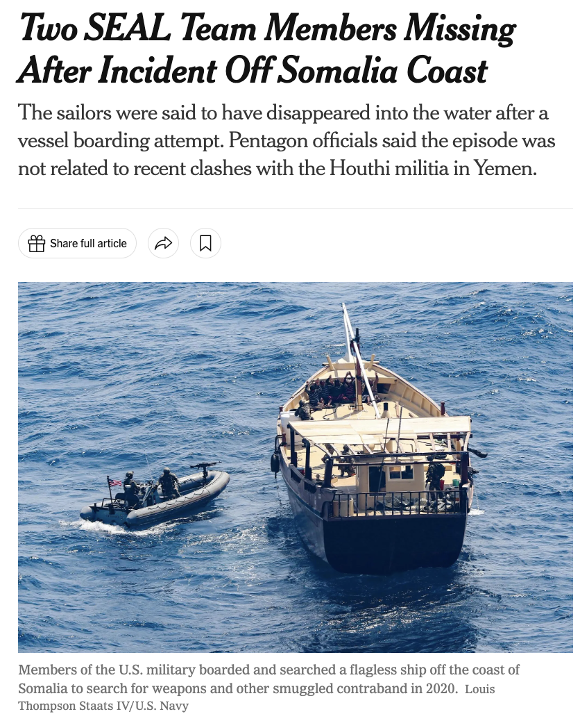 《纽约时报》援引五角大楼官员们的话报道,海豹突击队成员于周四被派往索马里海岸附近的一艘可疑船只。但目前还不清楚是什么原因促使突击队员挑出这艘船进行更深入的调查。