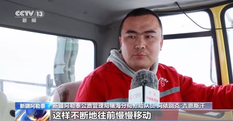 新疆阿勒泰公路管理局福海分局抢险队员 阿依别克·吉恩斯汗:难在雪崩路段雪特别高,高的地方比车还高,所以连续前进、后退,前进、后退这样不断地往前慢慢移动,才可以把雪抛出去,把路打通。