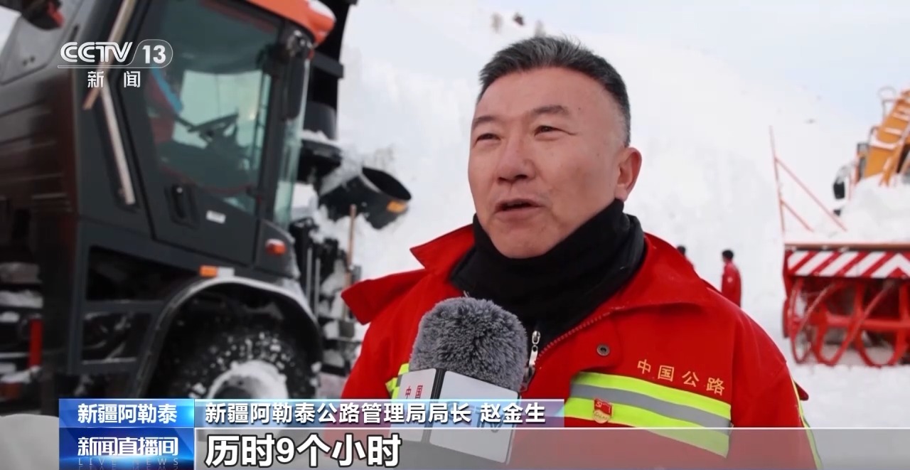 新疆阿勒泰公路管理局局长 赵金生:为了打通K59到K57路段,我们组织了24名抢险队员,14辆抢险机械,从早上8时开始历时9个小时,于下午5时全线贯通,彻底打通了从黑流滩机场到石头房子的卡脖子路段。