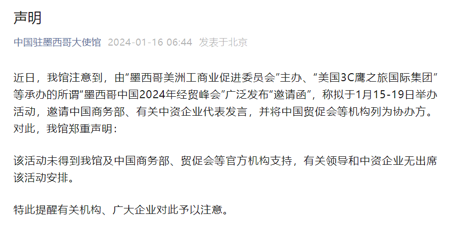 中国驻墨西哥大使馆16日发布声明称,近日,中国驻墨西哥大使馆注意到,由“墨西哥美洲工商业促进委员会”主办、“美国3C鹰之旅国际集团”等承办的所谓“墨西哥中国2024年经贸峰会”广泛发布“邀请函”,称拟于1月15-19日举办活动,邀请中国商务部、有关中资企业代表发言,并将中国贸促会等机构列为协办方。对此,中国驻墨西哥大使馆郑重声明: