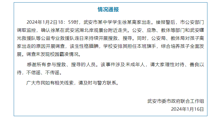 2024年1月2日18:59时,武安市某中学学生徐某离家出走。接报警后,市公安部门调取监控,确认徐某在武安洺湖北岸观景台附近走失。公安、应急、教体等部门和武安曙光救援队等公益专业救援队连日来持续开展搜救、搜寻。同时,公安局、教体局对孩子离家出走的原因开展调查,该生性格腼腆,学校安排其担任本班旗手,综合培养孩子全面发展。调查未发现校园霸凌情况。
