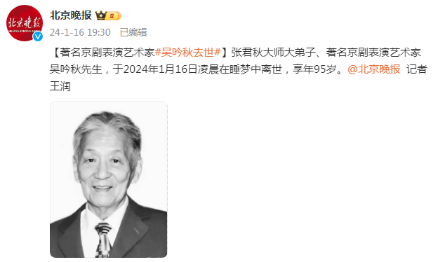 张君秋大师大弟子、著名京剧表演艺术家吴吟秋先生,于2024年1月16日凌晨在睡梦中离世,享年95岁。(北京晚报记者 王润)