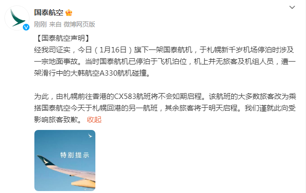 经我司证实,今日(1月16日)旗下一架国泰航机,于札幌新千岁机场停泊时涉及一宗地面事故。当时国泰航机已停泊于飞机泊位,机上并无旅客及机组人员,遭一架滑行中的大韩航空A330航机碰撞。