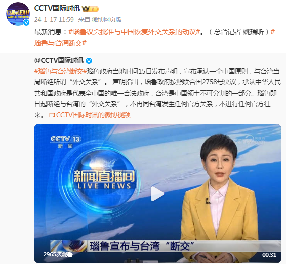 瑙鲁政府当地时间15日发布声明,宣布承认一个中国原则,与台湾当局断绝所谓“外交关系”。 声明指出,瑙鲁政府按照联合国2758号决议,承认中华人民共和国政府是代表全中国的唯一合法政府,台湾是中国领土不可分割的一部分。瑙鲁即日起断绝与台湾的“外交关系”,不再同台湾发生任何官方关系,不进行任何官方往来。