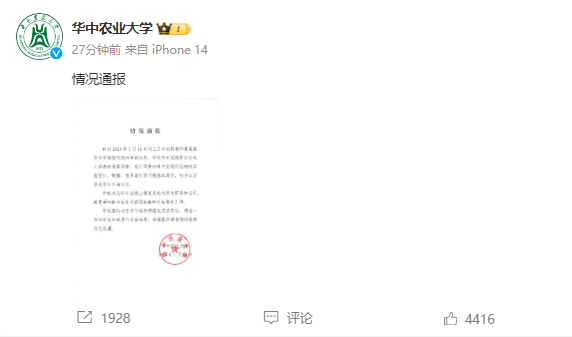 华中农业大学通报“教师涉嫌学术不端等问题”:成立工作专班,启动调查程序