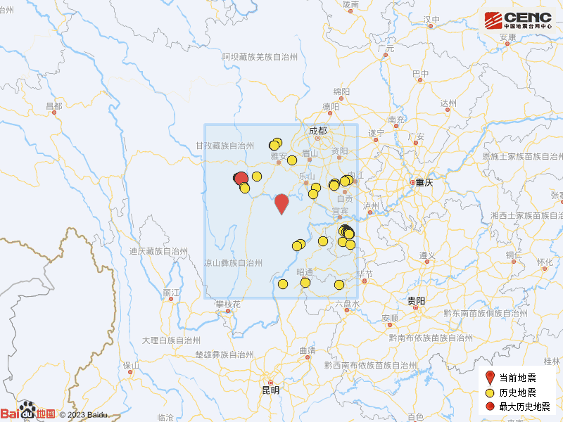 历史地震:根据中国地震台网速报目录,震中周边200公里内近5年来发生3级以上地震共288次,最大地震是2022年9月5日在四川甘孜州泸定县发生的6.8级地震(距离本次震中126公里),按震级大小前50次历史地震分布如图。