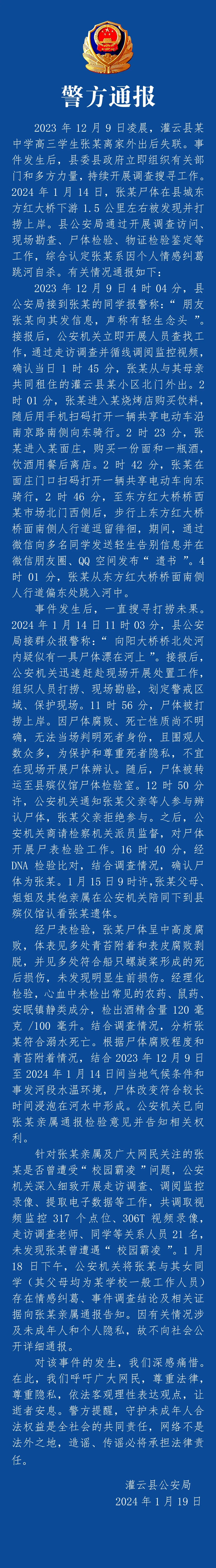 灌云县公安局1月19日发布警情通报,2023年12月9日凌晨,灌云县某中学高三学生张某离家外出后失联。事件发生后,县委县政府立即组织有关部门和多方力量,持续开展调查搜寻工作。2024年1月14日,张某尸体在县城东方红大桥下游1.5公里左右被发现并打捞上岸。县公安局通过开展调查访问、现场勘查、尸体检验、物证检验鉴定等工作,综合认定张某系因个人情感纠葛跳河自杀。
