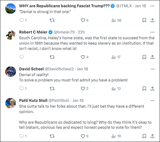 在这些吐槽声中,一位熟悉历史的网民指出,黑利的出生地南卡罗来纳州,在1861年南北战争爆发时坚决保留奴隶制,并成为首个试图退出联邦的州。还有不少人指责黑利,认为解决问题的第一步,是承认问题的存在,而不是像她这样否认现实。
