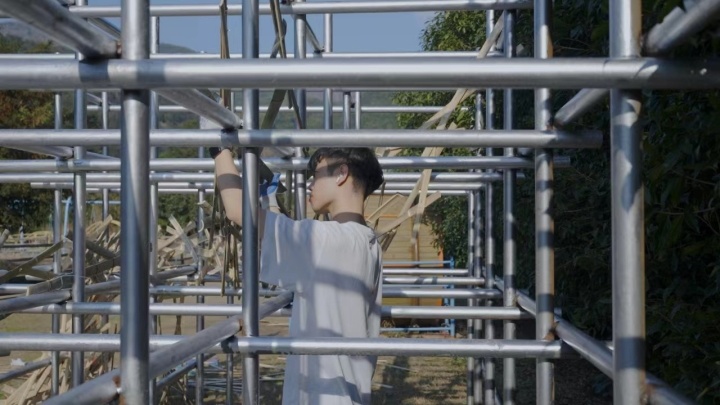 葛家村盛产竹子,是中国文化的重要组成部分。因此,丁含聪与小伙伴们决定创作一个不一样的艺术装置:用竹子、钢架和灯光照亮天空,代表着当地人的毅力;通过切割、绘画和连接竹片,同时以桂花树的形状呈现了葛家村的家谱网络,以竹结构和钢架体现了村民的开拓精神。装置还能为游客和居民提供休闲空间。