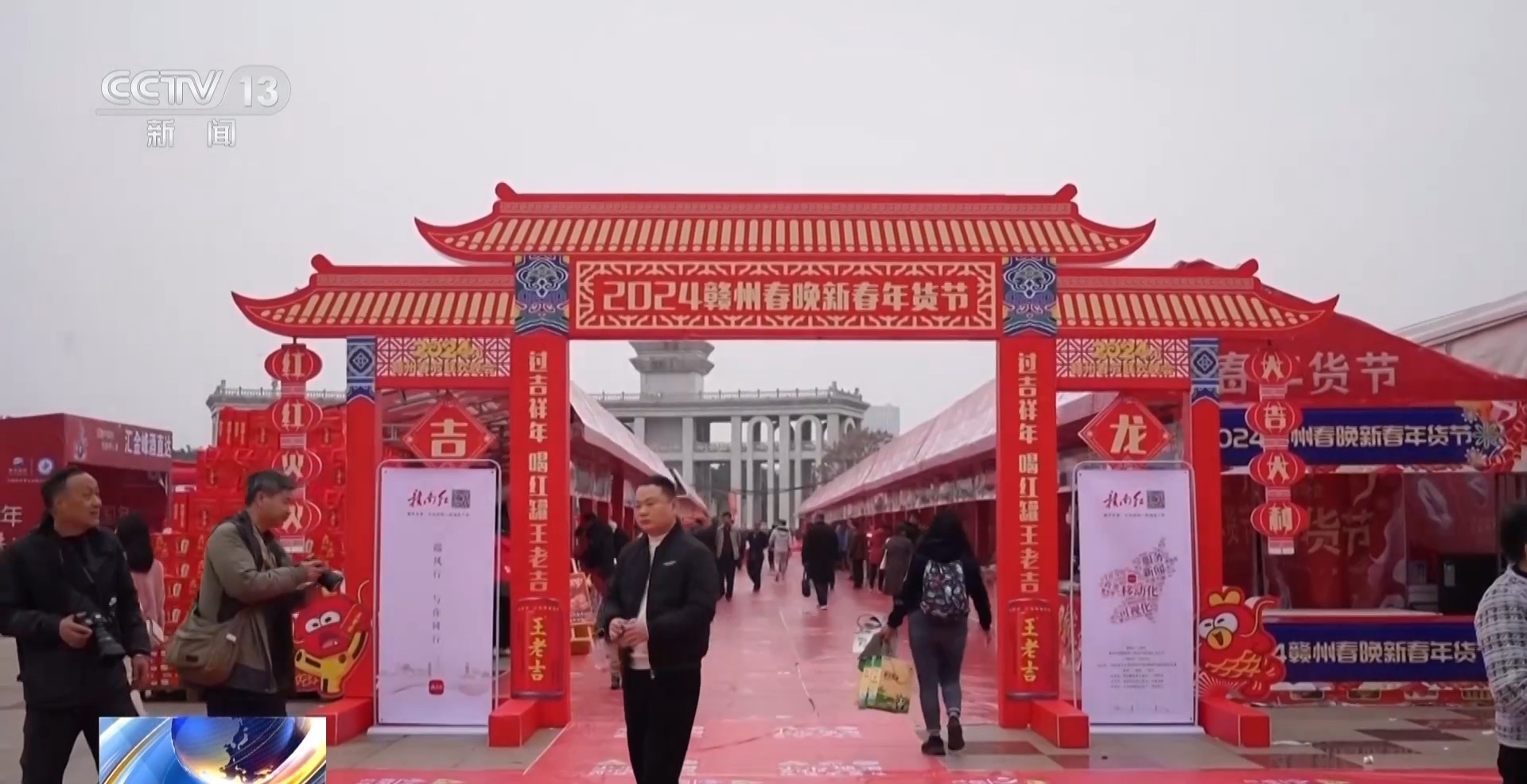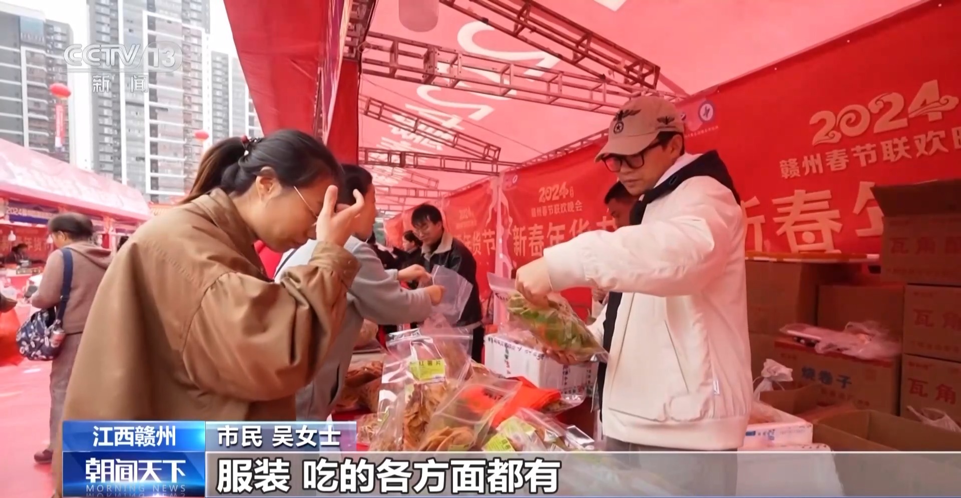 在江西赣州,临时搭建的年货摊位整齐有序,糖果饼干等传统年货以及赣南本土的黄元米果、板鸭等名优特产让人挑花了眼。