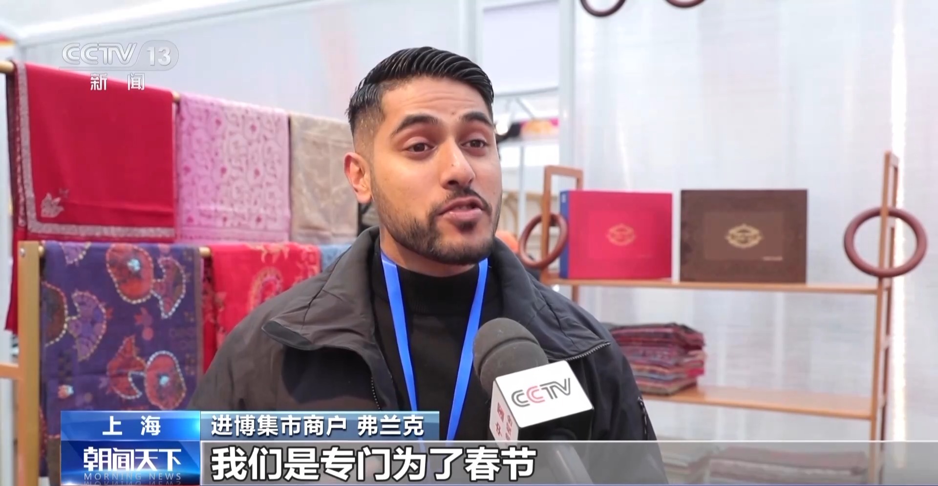 进博集市商户 弗兰克:中国过年的时候,大家都喜欢买买东西,喜欢送送礼物,我们是专门为春节做了红色的礼盒,还有红色的手绣羊绒围巾,还有男士红色羊绒衫。中国过年还是挺热闹的,所以我们也想体验一下。