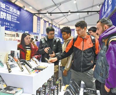 在义乌国际商贸城,外国客商在二区垂直展采购小家电。