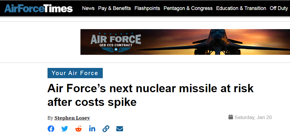 但正所谓“纸包不住火”,“哨兵”导弹项目随后的各种幺蛾子就来了——预算一次次增加、研制进度一次次拖延。按照《空军时报》的说法,如今该项目不但成本暴增了37%,而且服役时间可能也要推迟两三年。