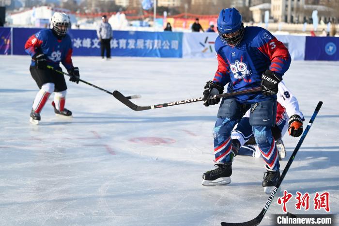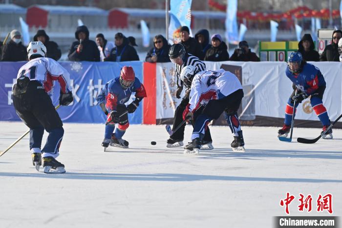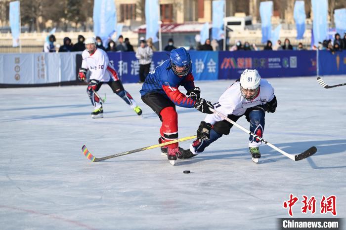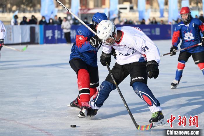 内蒙古呼和浩特市,呼和浩特冰球队(白衣)与蒙古国“Otgon Od”队(蓝衣)激烈争抢。 中新网记者 刘文华 摄