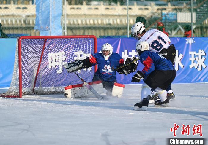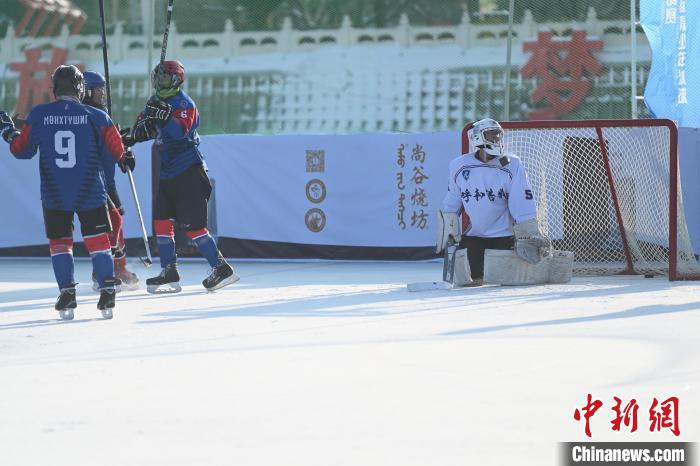 内蒙古呼和浩特市,呼和浩特冰球队(白衣)进球瞬间。 中新网记者 刘文华 摄