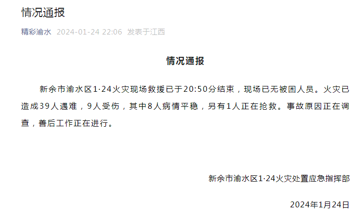 情况通报新余市渝水区1·24火灾现场救援已于20:50分结束,现场已无被困人员。火灾已造成39人遇难,9人受伤,其中8人病情平稳,另有1人正在抢救。事故原因正在调查,善后工作正在进行。新余市渝水区1·24火灾处置应急指挥部2024年1月24日