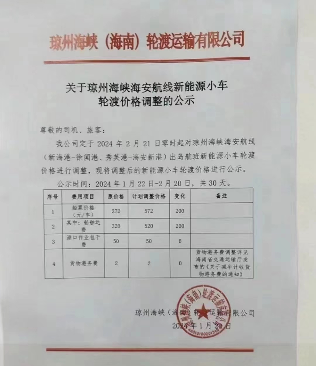 琼州海峡(海南)轮渡运输有限公司针对新能源小车涨价的公示,1月25日成为海南民众关注的热点。