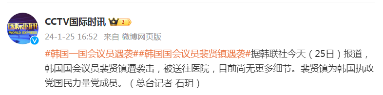 突发!韩媒:韩国国会议员裴贤镇遭袭击,被送往医院