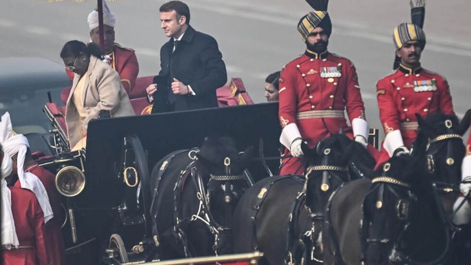 美联社报道说,印度总统穆尔穆、总理莫迪以及马克龙出席阅兵式,穆尔穆与马克龙共同乘坐礼仪马车抵达阅兵式现场,莫迪在现场迎接马克龙。