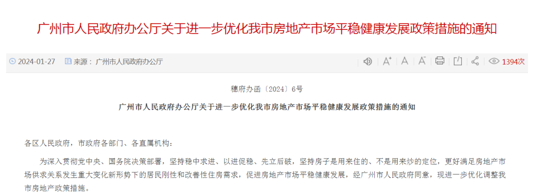 此外,广州还明确继续加大住房保障力度、精准支持房地产项目合理融资需求加强房地产市场监管等政策措施。通知自2024年1月27日起正式实施。