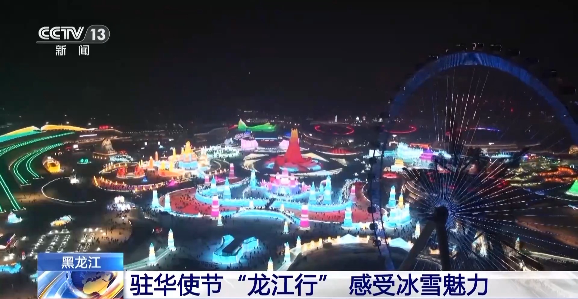 1月26日晚,驻华使节和外交官又来到了哈尔滨冰雪大世界参观,驻华使节和外交官欣赏五彩缤纷的冰灯、形态各异的雪雕,感受充满奇趣的冰雪世界。使节和外交官们最后来到中央广播电视总台设立在哈尔滨冰雪大世界的“冰雪演播室”,近距离观看新闻直播操作流程。