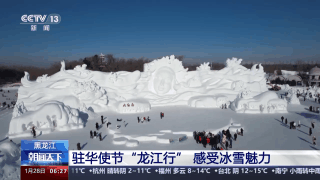 在哈尔滨,驻华使节和外交官到第36届太阳岛雪博会园区进行参观,驻华使节在欣赏美轮美奂的雪雕同时,不禁赞叹创作雪雕背后的努力。