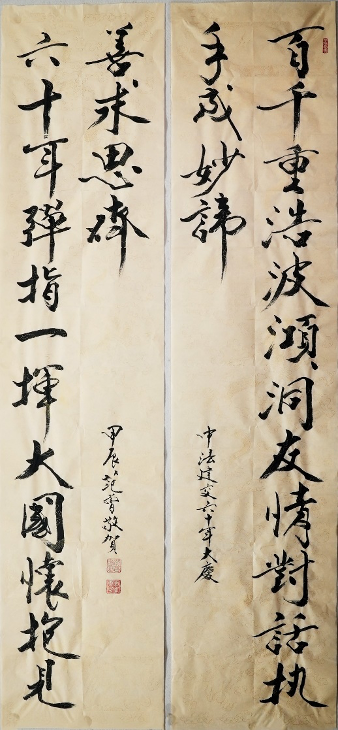 2024年1月27日,是中法建交六十周年纪念日。在中法建交一甲子的历史节点,中国书画巨匠、“法国荣誉军团骑士勋章”获得者范曾先生特地创作了一副对联:百千重浩波澒洞,友情对话,执手成妙谛;六十年弹指一挥,大国怀抱,见善求思齐。