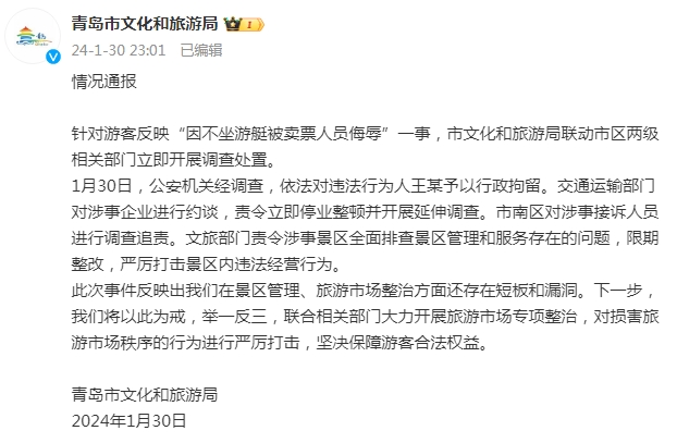 1月30日,公安机关经调查,依法对违法行为人王某予以行政拘留。交通运输部门对涉事企业进行约谈,责令立即停业整顿并开展延伸调查。市南区对涉事接诉人员进行调查追责。文旅部门责令涉事景区全面排查景区管理和服务存在的问题,限期整改,严厉打击景区内违法经营行为。