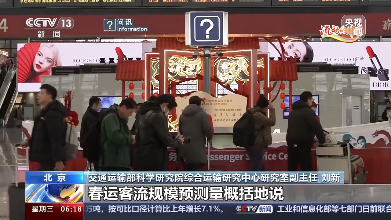 交通运输部科学研究院综合运输研究中心研究室副主任 刘新:春运客流规模预测量,概括地说,就是根据春运客流历史数据以及日常监测和统计的客流、小客车流量等数据,统筹考虑趋势变化规律测算得出的。