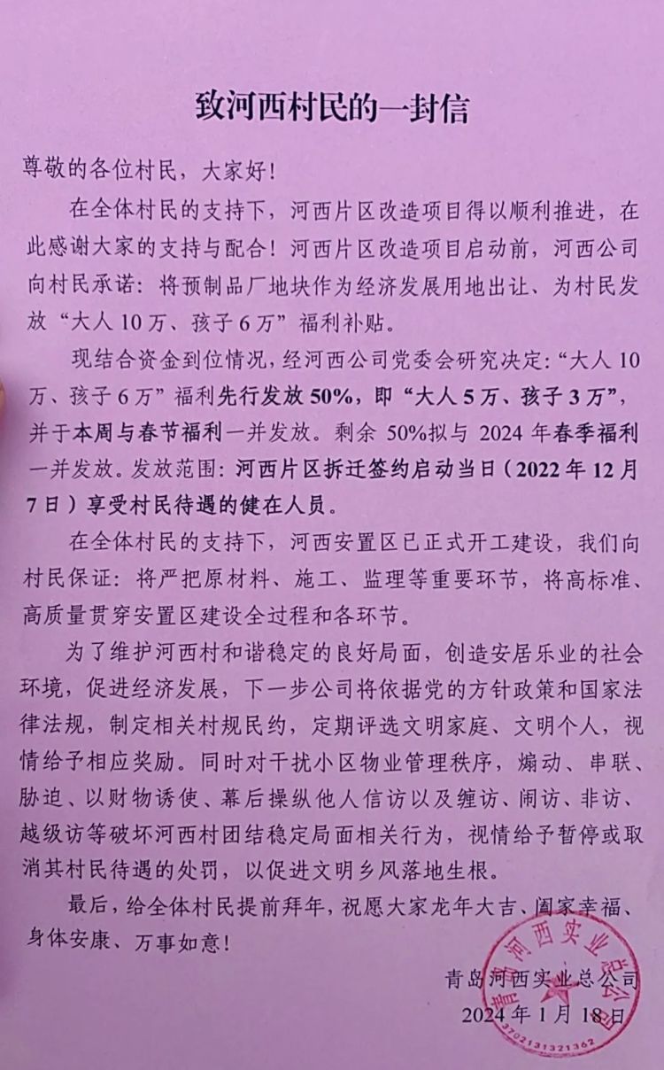 现结合资金到位情况,经河西公司党委会研究决定:“大人10万、孩子6万”福利先行发放50%,即“大人5万、孩子3万”,并于当周与春节福利一并发放。剩余50%拟与2024年春季福利一并发放。发放范围:河西片区拆迁签约启动当日(2022年12月7日)享受村民待遇的健在人员。