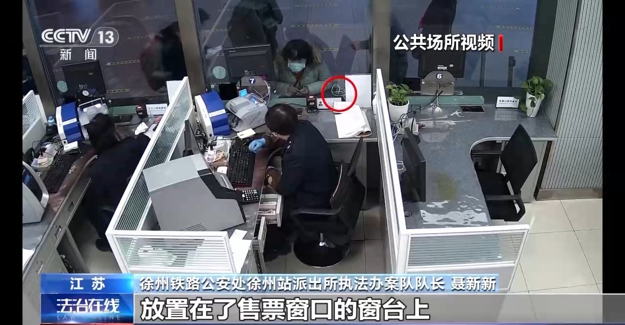 徐州铁路公安处徐州站派出所执法办案队队长 聂新新:我们发现该男子在买完票后,转身离开售票窗口,去核对自己的车票信息。这时,他依然将自己的手机放置在了售票窗口的窗台上。